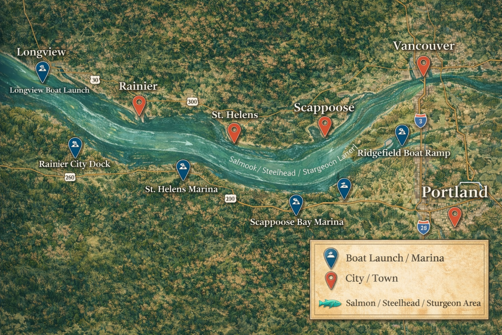 This stretch transitions from tidal water into classic big-river fishing, offering consistent salmon and sturgeon opportunities with easier boat access.